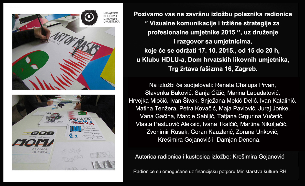 Pozivamo vas na završnu izložbu polaznika radionica ” Vizualne komunikacije i tržišne strategije za profesionalne umjetnike 2015. “, uz druženje i razgovor s umjetnicima, koje će se održati 17. 10. 2015. od 15 do 20 h, u Klubu HDLU-a, Dom hrvatskih likovnih umjetnika, Trg žrtava fašizma 16, Zagreb.