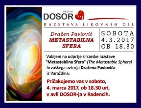 U subotu, 4. 3. 2017. u 18, 30 sati, u prostorima DOSOR u Radencima (Prisojna cesta 4a, 9252 Radenci, Slovenija), otvara se izložba slika Dražena Pavlovića, pod nazivom ”Metastabilna Sfera”.