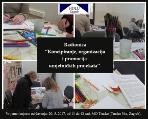 U subotu, 20. 5. 2017. od 11 do 13 sati, HDLU Zagreb u suradnji sa likovnom udrugom InArt organizira strukovnu radionicu pod nazivom ”Koncipiranje, organizacija i promocija umjetničkih projekata – izložbi i kreativnih radionica”, a koja će se održati u prostoru MO Trnsko (Trnsko 34a, Zagreb).