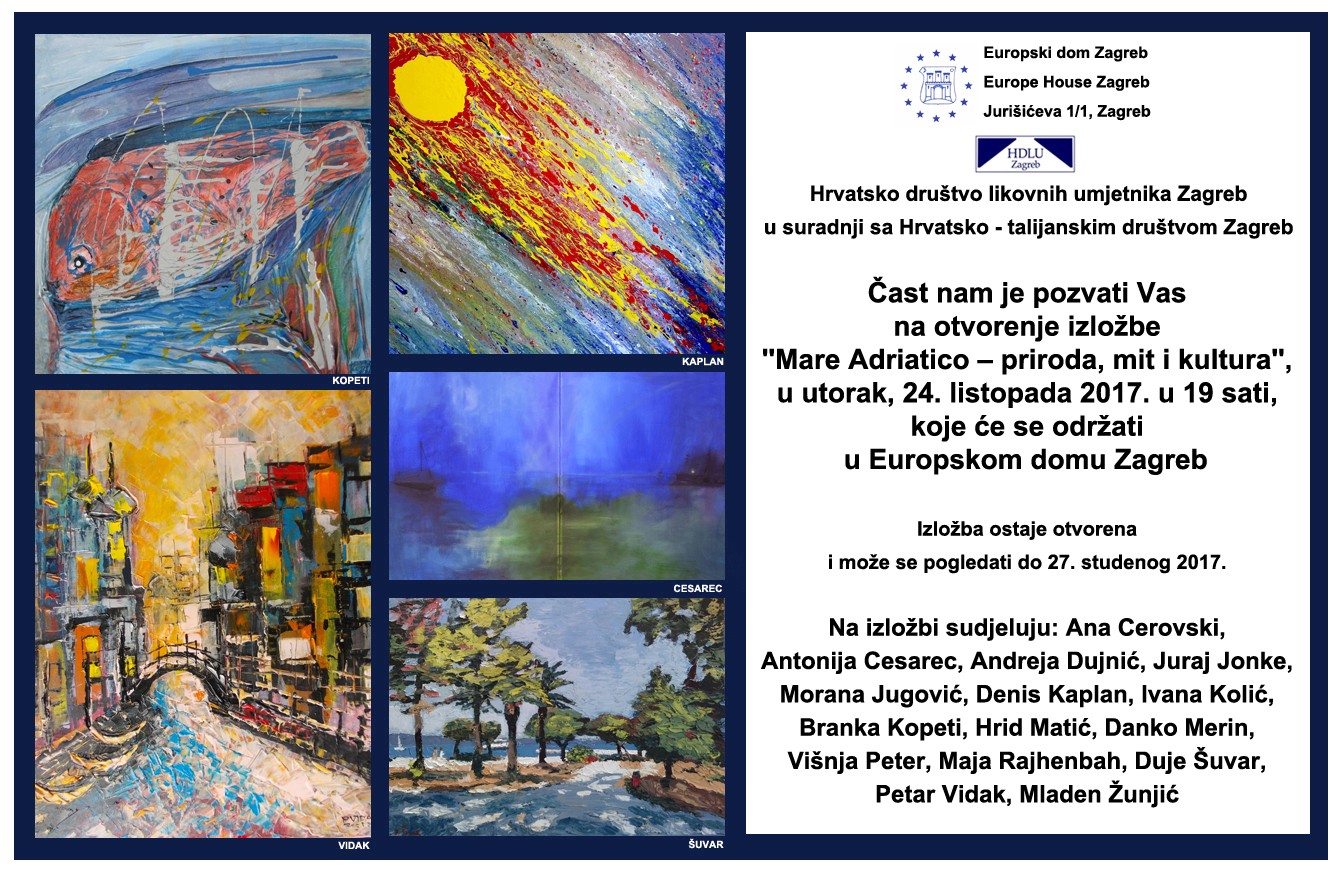 Hrvatsko društvo likovnih umjetnika Zagreb u suradnji sa Hrvatsko – talijanskim društvom Zagreb i Europskim domom Zagreb organizira izložbu ”Mare Adriatico – priroda, mit i kultura”, na kojoj 15 zagrebačkih umjetnika u svojim djelima predstavljaju prizore uz obale Jadranskog mora i zemalja u njegovom okruženju, kroz živopisni kolorit mediteranskog ozračja. Više o izložbi na portalu ”Zagrebački likovni umjetnici”.