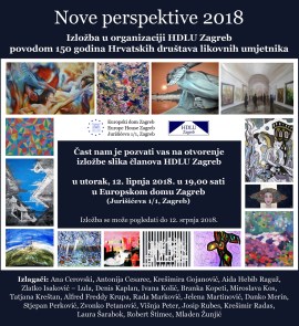Hrvatsko društvo likovnih umjetnika Zagreb izložbom ”Nove perspektive 2018” u Europskom domu Zagreb želi obilježiti 150 godina postojanja strukovnih Hrvatskih društava likovnih umjetnika, kojih danas ima 10 (na Popisu umjetničkih strukovnih udruga Ministarstva kulture RH), te su sva ta društva kroz vrijeme, odvajanjem i osamostaljivanjem, proistekla iz prvobitnog Društva umjetnosti, koje je utemeljeno 1868. godine u Zagrebu. Zadnje društvo koje se odvojilo od HDLU-a kao samostalno zagrebačko udruženje, jeste i naš HDLU Zagreb, osnovan 2015. u Zagrebu, gdje regularno kao pravna osoba počinje djelovati 12. 6. 2015. godine. Tako će ova izložba ujedno biti i prilika da se proslavi 3. godišnjica HDLU Zagreb. Više o izložbi i autorima može se pročitati na portalu Zagrebački likovni umjetnici.