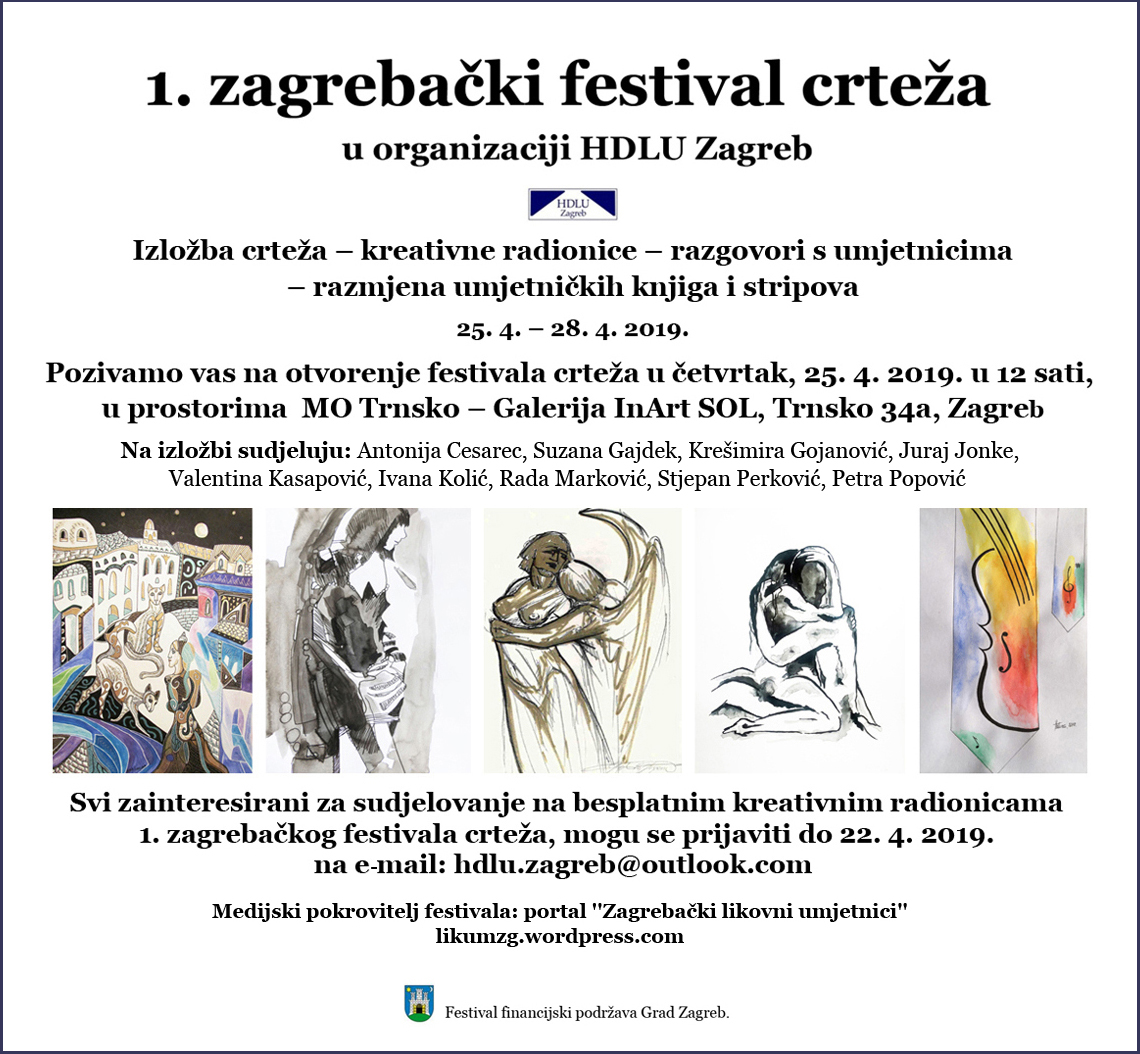 Svi zainteresirani za sudjelovanje na besplatnim kreativnim radionicama 1. zagrebačkog festivala crteža mogu se prijaviti do 22. 4. 2019. na e-mail: hdlu.zagreb@outlook.com