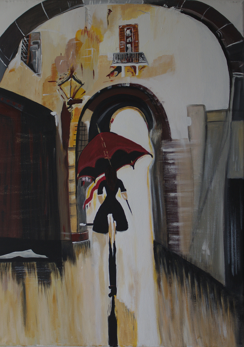 Snježana Šebalj zaokružila je još jednu slikarsku priču, ovoga puta posvećenu kišnim šetnjama u urbanom okruženju, gdje se u mokrini pločnika ogledaju siluete udaljenih zgrada i elegantnih prolaznica, koje kao da su izašle iz nekih starih, stiliziranih noir filmova. Skrivenih lica ispod kupole kišobrana, žene izduženih figura u centralnoj kompoziciji, ponekad u pratnji muškarca ili malog psa, obavijene su oblačnim sfumatom pastelnih nijansi, kroz koje se u svim smjerovima rasprskavaju bjeličaste kapi kiše, slijedeći ritam njihovih koraka.