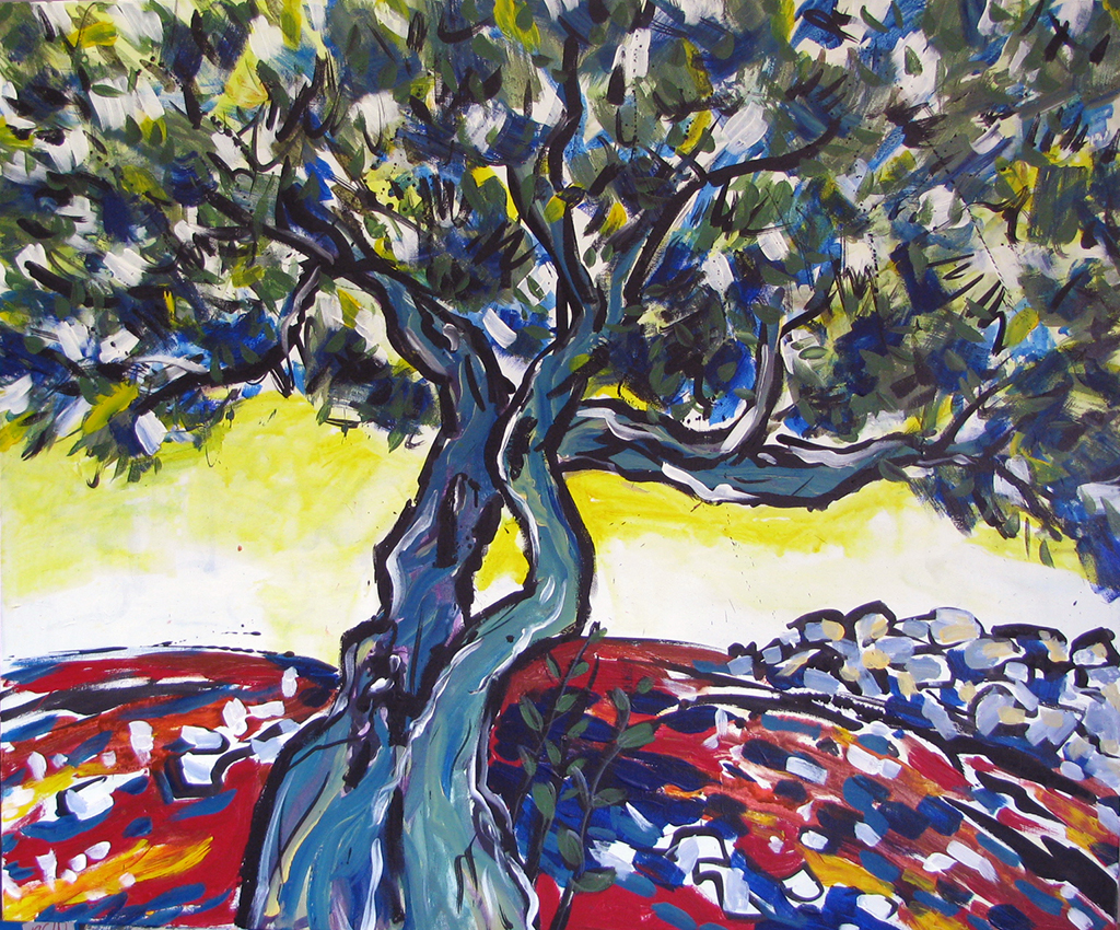 Na rahloj, crvenkasto – smeđoj zemlji prošaranoj bijelim gromadama nepravilnog kamenja i suhozidima, izrastaju kvrgava debla maslina, koja se ponegdje kružno granaju i isprepliću u strukturama gustih, zelenkasto – plavičastih krošnji. Čvrsta i stamena, na rubovima polja i vinograda, stabla maslina u slikarskim potezima kroz sebe reflektiraju boju iz okoline, titravu vrelinu podnevnog sunca, sparinu koja prži škrtu zemlju i tirkizno – sivu oblačnost neba pred oluju.