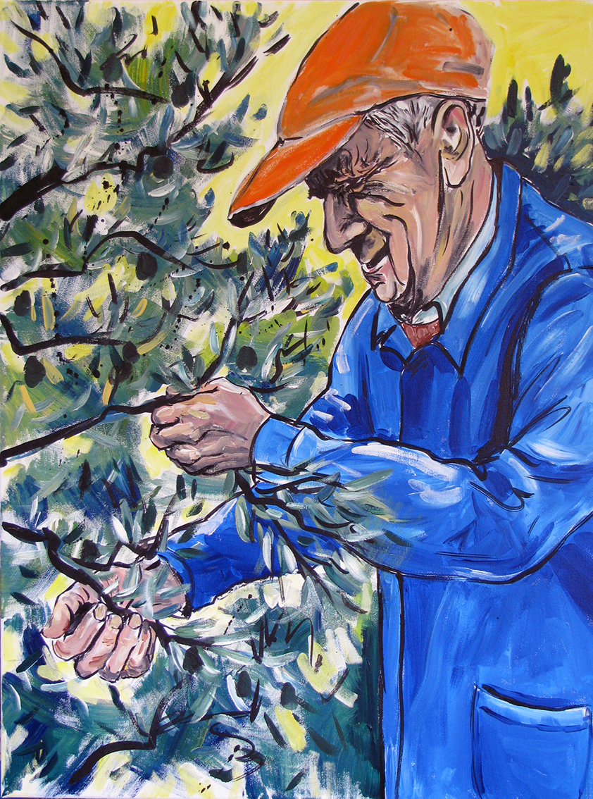 Od davnina su masline udomaćene uz ljude kao simbol mira, zaštite, iscjeljenja i blagostanja, njihovo ulje služilo je za masažu i njegu vladarima, kao hrana, lijek i gorivo za svjetiljke. Tako su i ljudi na Jeleninim slikama u berbi maslina poprimili nešto od njihovog kolorita i karaktera: stari maslinari koji vretenastim, spretnim prstima ubiru još nedozrele masline, tamno zelenkaste ili crne, sazrele i sočne, pažljivo prebiru njihove grančice, žive u njihovim sjenama, mirisima i ciklusima, sa nepomičnim i mirnim pogledom gledaju prema naprijed, svjesni tradicije koju žele očuvati, znanja kojega moraju prenijeti mlađim generacijama.