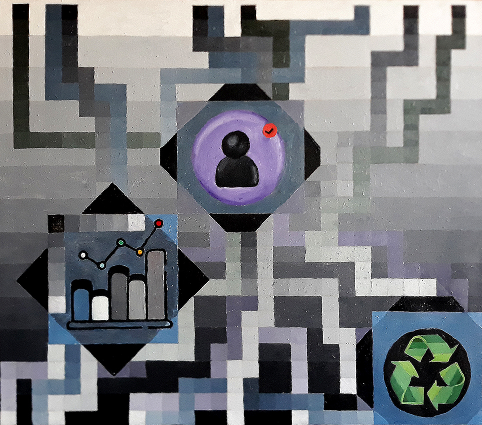 Darija Dolanski Majdak kroz geometrijsku apstrakciju u seriji radova propituje univerzalne teme života na zajedničkoj planeti, harmoniju u prožimajućim odnosima svijetlih i tamnih ploha i mistične stilizirane piktograme, koji kao da su osmišljeni za sporazumijevanje sa nekom vanzemaljskom civilizacijom. Ljiljana Tršan u crtačkim strukturama stvara futuristički lik vremenskog putnika, a Marija Čingel kroz razlivene mrlje definira kružne vrtloge slikarevog sna, slobodnu gestu prepuštenu eksperimentu i slučajnostima u istraživanju nepoznatog.