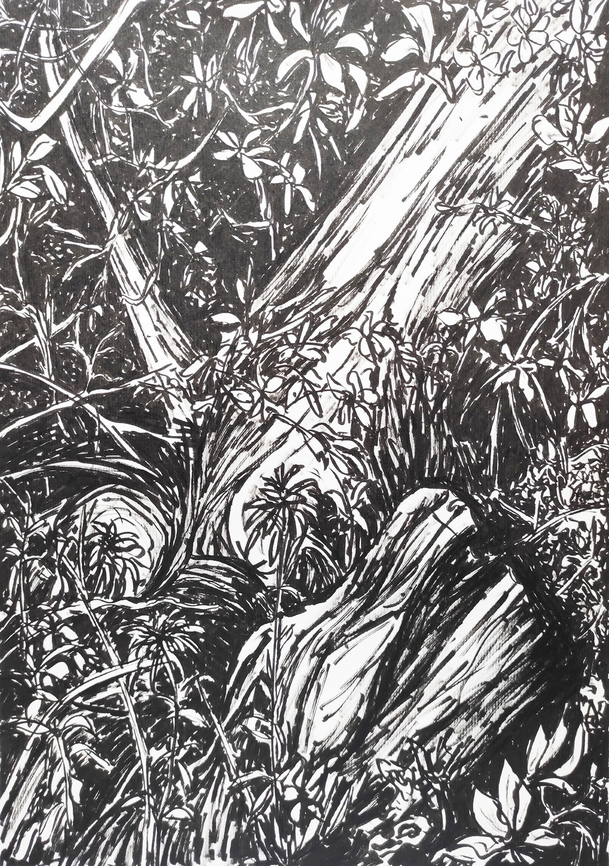Ponegdje se linije zgušnjavaju u prepletenim strukturama što nas podsjećaju na krvotok Zemlje iz dubina, cvijetne livade i gnijezda, a negdje opet u minimalističkoj gesti vrsnih crtača izranjaju obrisi mačijih brkova, melankolične ženske siluete i namreškani krugovi vode. Na pojedinim radovima gubi se granica između crteža i slike, boje definiraju pozadinu i uokviruju crno bijele figure, riblja tijela i plesne parove u raskošnim bravurama, kad na početku putovanja ne znamo kuda smo se točno zaputili, no puštamo da nas vodi ritam kompozicije, istraživački impuls i potraga za ravnotežom svjetla i tame. Crtež tako postaje i hedonistički čin uranjanja u vlastita podmorja psihe i snova, gdje se prisjećamo samotnih jutara, starih ljubavi, rastanaka, ali i radosnih lutanja šumskim stazama, priča koje smo pričali u ciklusima, u kojima se vlastiti život pretvarao u doživljaje bajkovitih junaka.
