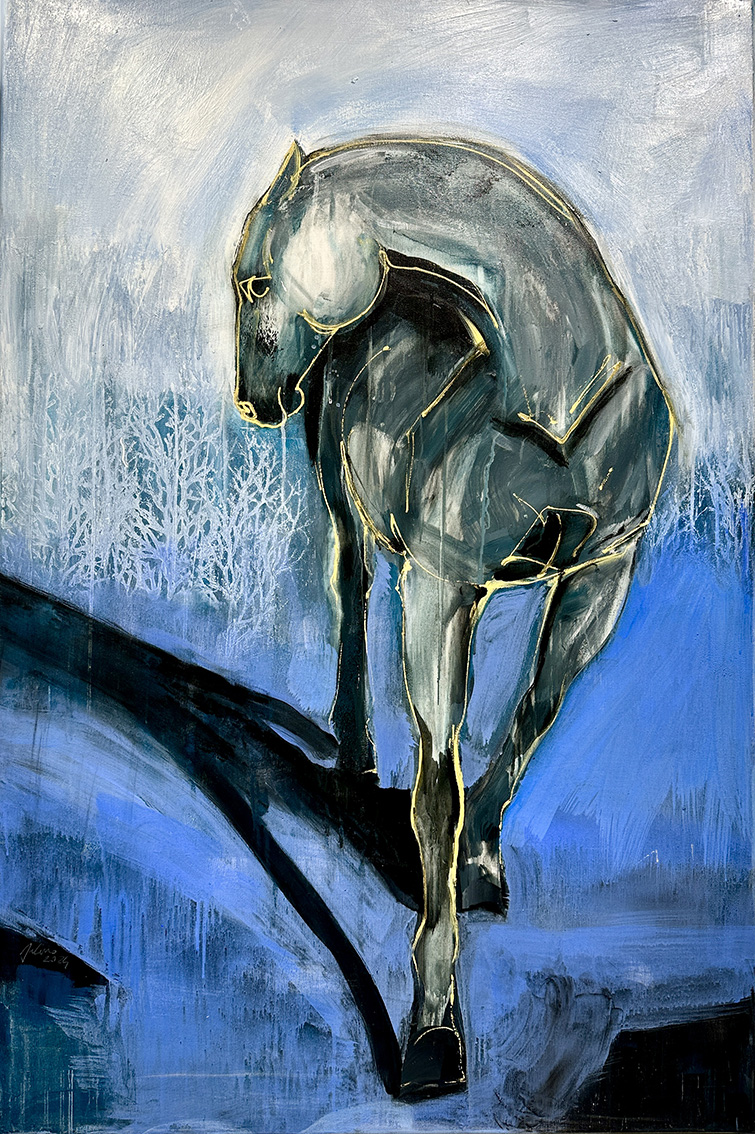 Na slici Jelene Martinović većeg formata, sivi konj pognute glave, smiren i samodostatan, anatomski je definiran tonskim preljevima svjetla i sjena, dok Ana Bušalić slika intrigantnu kompoziciju konja, čija tijela se preklapaju tvoreći zbijeni oblik četverokuta, poput nekog drevnog simbola upregnutih životinja koje se vrte u krug, bez mogućnosti da se iz njega oslobode. Mali pas na slici Luke Koščaka u blistavom zelenilu nagovještava tihi susret umjetnika sa njegovim ljubimcem, toplinu i povjerenje udomaćene životinje. Kristinka Klarić također slika domaće životinje na slici ‘’Mačji svijet’’, gdje su dvije mačke u igri smještene na cvjetnoj podlozi unutar imaginarnog okvira, što nam sugerira neki unutarnji, zaštićen i siguran prostor.
