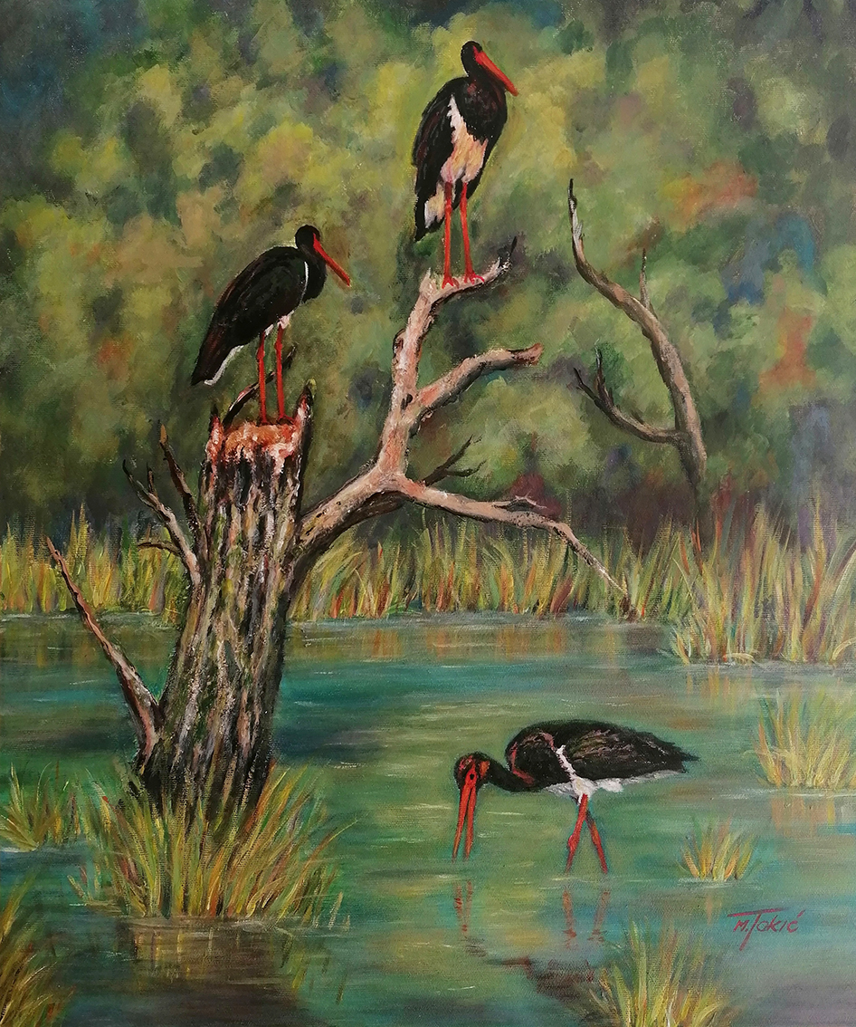 Marija Tokić slika crne rode koje se u našim krajevima mogu vidjeti u Lonjskom polju, u skrovitim uvalama močvarnih voda kako se gnijezde na visokom drveću, a Rada Marković dočarava nam elegantne plamence izduženih oblika, kako žarkom bojom kontrastno vibriraju na isparavajućoj pozadini neke samotne lagune, dok Dalibor Rubido u mističnom plavetnilu prozračnim potezima opisuje bijela guščija tijela uz vodu. Stjepan Perković sa svojim patkama u jezeru slika blago lelujavu površinu vode, na kojoj plutaju obla pačja tijela ispred razigranih vlati trave – ovaj umjetnik u jednostavnim motivima iz prirode zna dočarati iskonski mir bivanja, koji nas gotovo hipnotično privlači prema središtu slike.