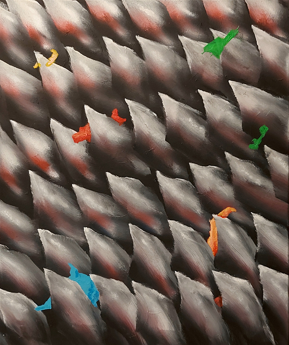 Marijan Zdunić na ribljim krljuštima doslikava mikroplastiku što truje naša mora, upozoravajući nas na opasnosti suvremene civilizacije koja intenzivno uništava prirodu na mikro i makro planu. Riblja tijela vidimo i na slici Mladena Žunjića u stiliziranim oblicima jarkih boja, ali i na delikatnom reljefu Mirele Brescher, na kojemu se jato riba raznih veličina dinamično preklapa i giba od rubova prema centru slike, dok Valentina Kasapović slika na svili plavičasta, srebrna i zelena riblja tijela kako se zgušnjavaju u izduženoj spirali.
