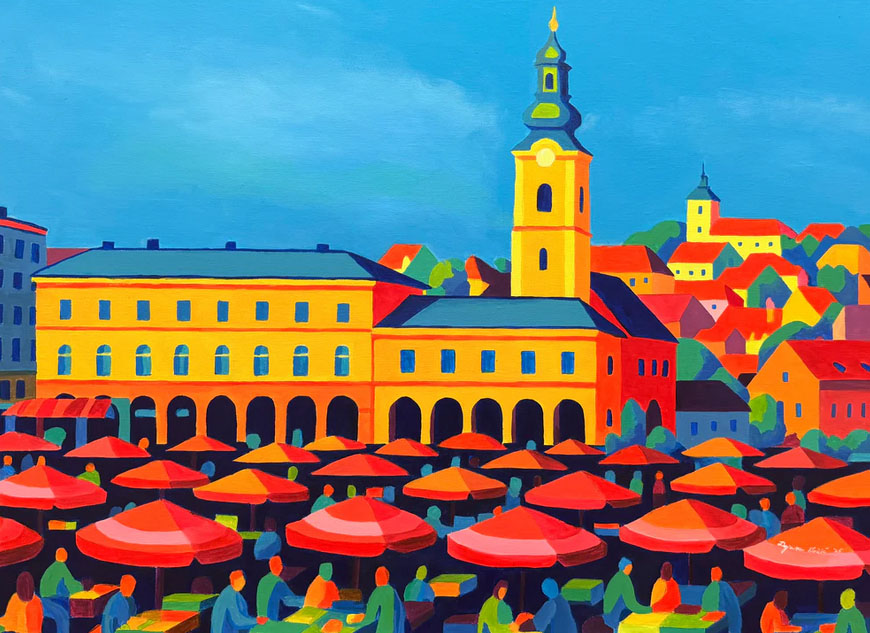Mladen Sekulić na svojoj slici predstavio nam je Pulsku arenu okruženu čarolijom tirkizno zelenih i blijedo plavih tonova, dok nam Dejana Nežić prikazuje zagrebački Dolac u svom karakterističnom snažnom i čistom koloritu na stiliziranim plohama suncobrana, gradskih krovova, zidova i prozora.