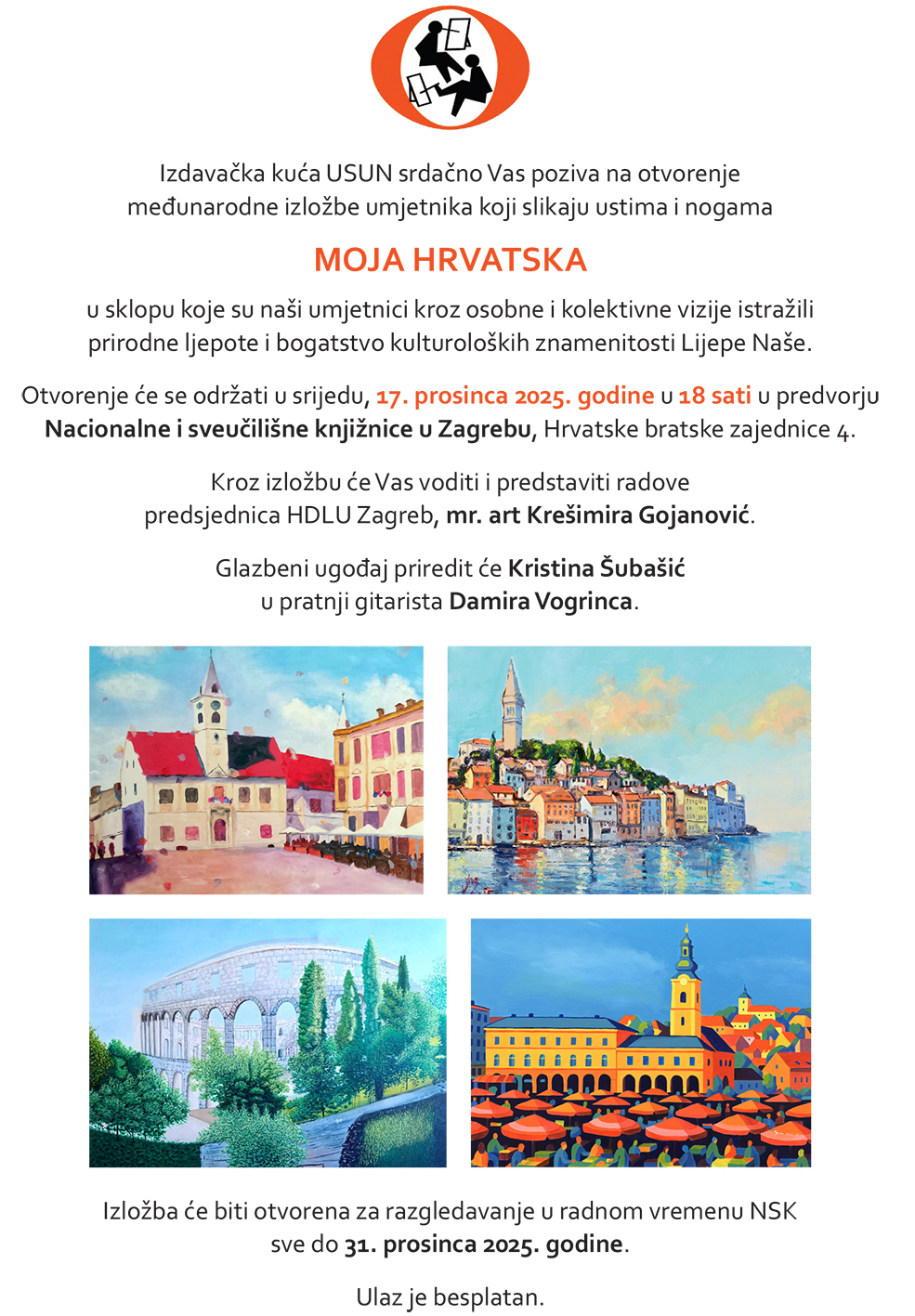 Izdavačka kuća USUN poziva na otvorenje međunarodne izložbe umjetnika koji slikaju ustima i nogama, pod nazivom ”Moja Hrvatska”, u srijedu, 17. prosinca 2025. godine u 18 sati u predvorju Nacionalne i sveučilišne knjižnice u Zagrebu (Hrvatske bratske zajednice 4, Zagreb).