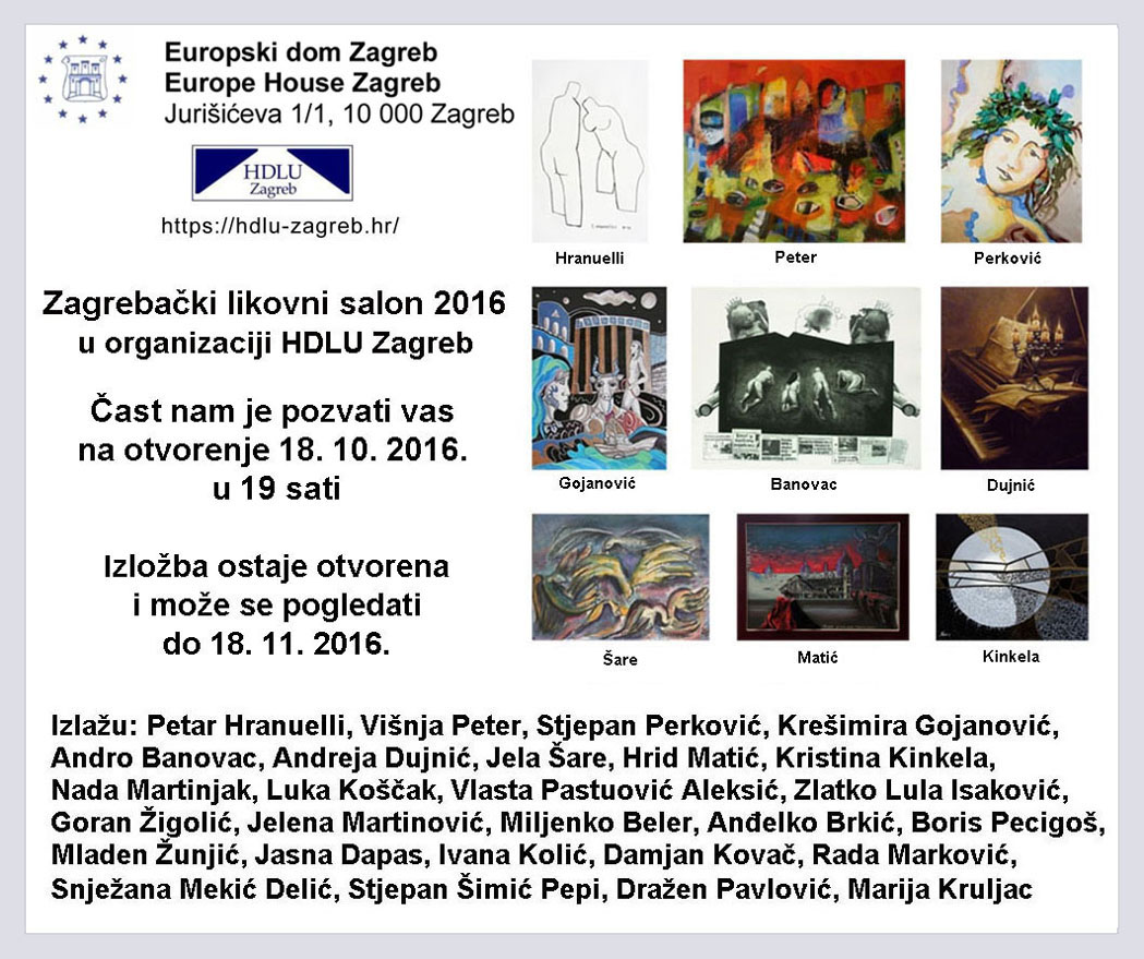 U utorak, 18. 10. 2016. u 19 sati, u Europskom domu Zagreb ( Jurišićeva 1/1, Zagreb ), otvara se ” Zagrebački likovni salon 2016 ”, u organizaciji HDLU Zagreb. Izložbu će otvoriti Renata Bačić ispred Europskog doma Zagreb, te Krešimira Gojanović i Robert Štimec ispred HDLU Zagreb. Izložba će se moći pogledati do 18. 11. 2016.
